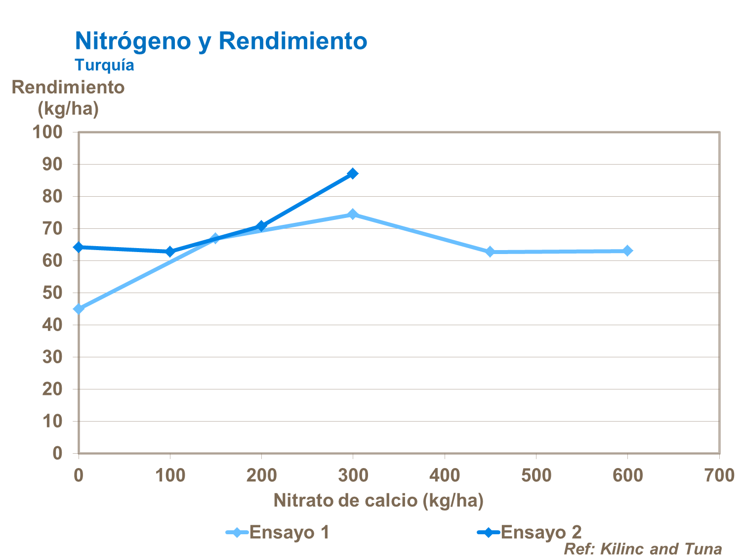 Demasiado nitrógeno puede reducir la producción, por eso es importante confirmar las tasas de aplicación con ensayos locales. Este gráfico de Turquía muestra como un exceso de nitrógeno reduce la producción.